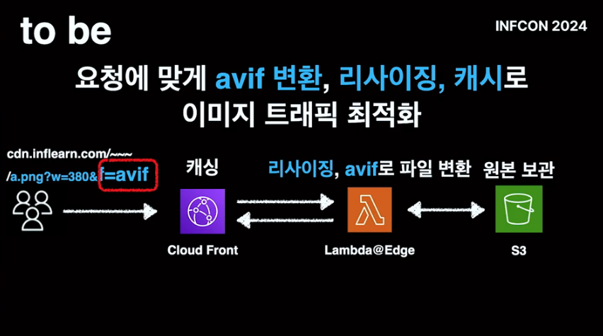 기존 아키텍처에서 lambda에 이미지 파일 포맷을 AVIF로 변환하는 로직을 추가했다.