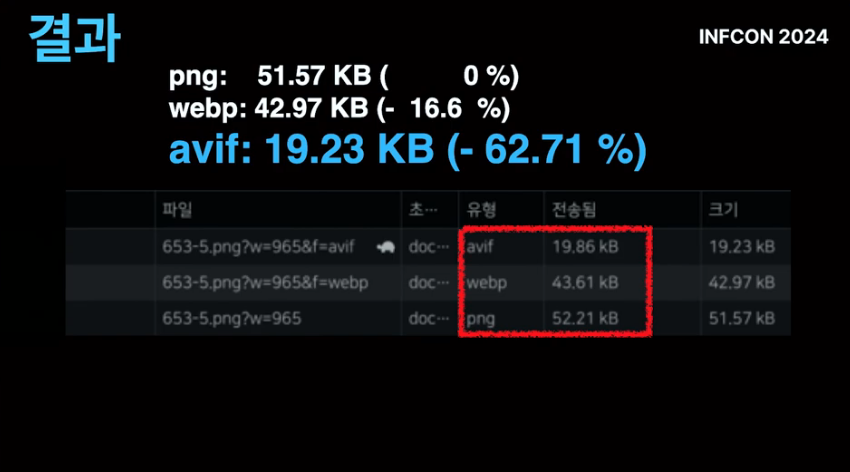 실제로 다른 파일 포맷과 크기를 비교해 보면 AVIF가 얼마나 효율적인지 확인할 수 있다.