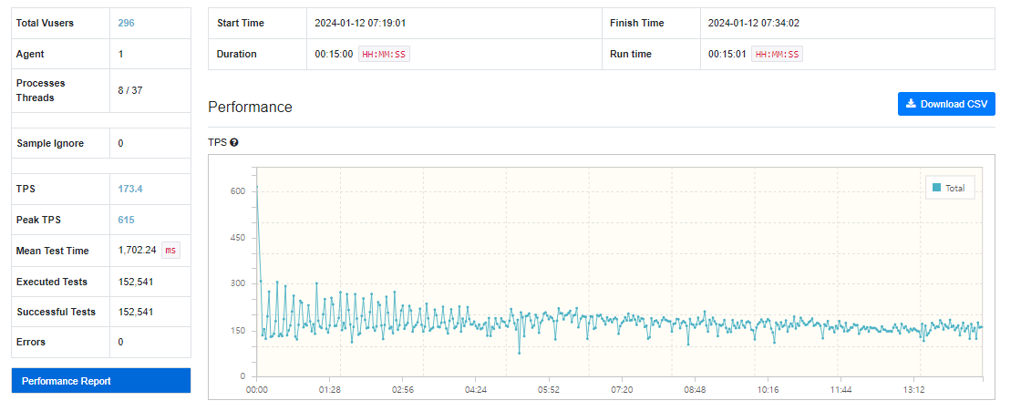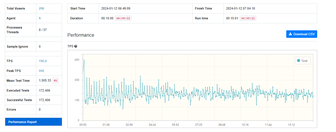 300명의 가상유저를 가정하고 15분 동안 투표 생성 API , 공지 생성 API , 투표와 공지 조회 API를 테스트해 봤다.